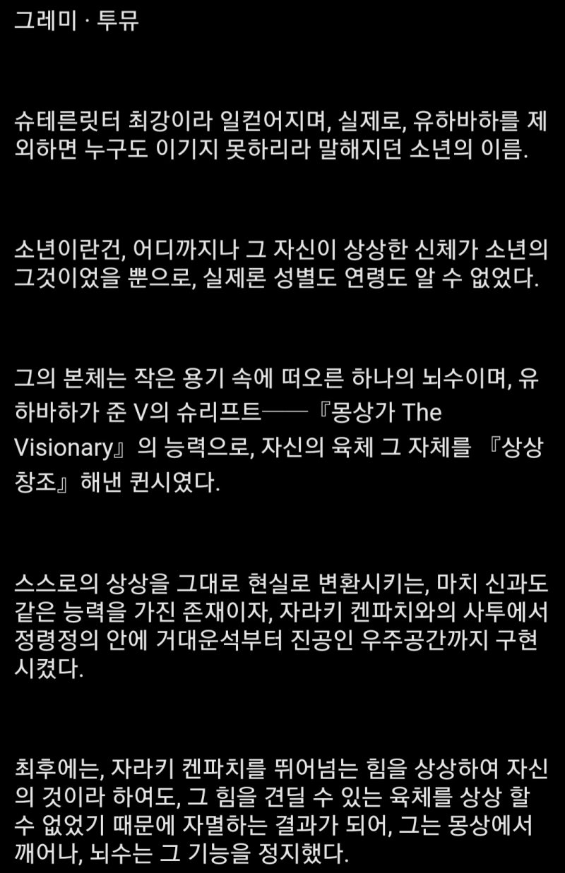 그럼에도 그레미보다 강한 자라키나 완빙 토시로가 리제 못 이기는 건 다양한 이능으로 공략 가능한 그레미랑 달리 깡물리캐라 타격할 방법이 없어서 진다고 봐야 할듯